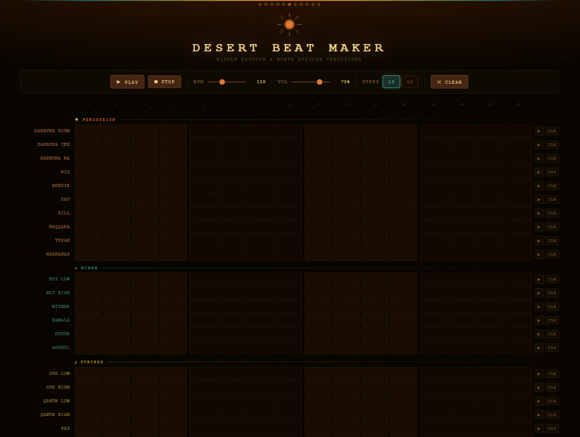 Desert Beat Maker is a fast, addictive rhythm creator where you build beats using 24 Middle Eastern–inspired instruments. Tap in patterns, switch between 16 or 32 steps, and bring your rhythm to life with glowing desert visuals. Easy to start, hard to stop—create your own vibe in seconds.